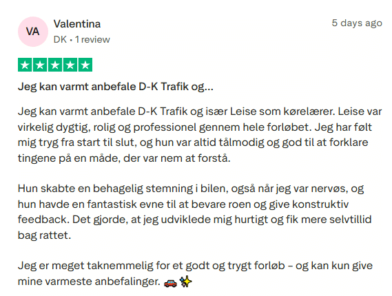 Jeg sætter en ære i, at du hos os får en god oplevelse – og glæder mig til at kunne byde dig velkommen som elev hos D-K Trafik.